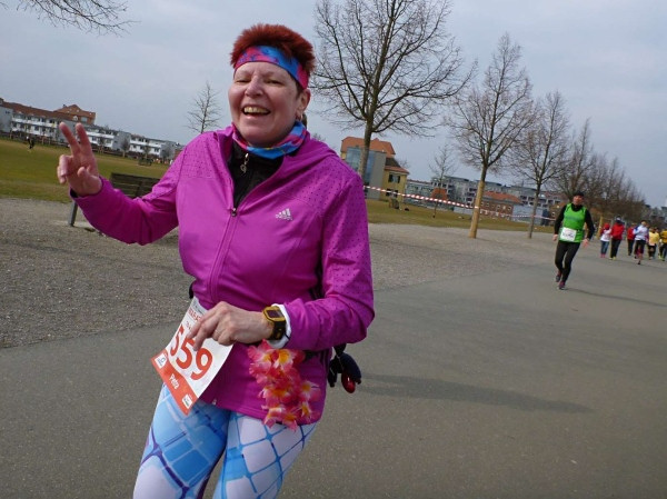 Ich treffe eine Läuferin, die eine Kuh um die Hüften trägt und einen Engel - und noch andere merkwürdige Verkleidungen. Plötzlich läuft ein Läufer neben mir, der mich grüßt, ich weiß erst nicht, wer er ist, aber er outet sich als Anton Lautner von "Marathon4you". Er läuft jedes Jahr bei unserem IndoorMarathon mit und macht Bilder, danach findet man die Bilderstrecken zusammen mit tolle Laufberichteauf der homepage von marathon4you.de. Anton mach ein Bild von mir, ich freue mich als ich es hinterher im Internet wiederfinde (siehe oben). Auch Gerda steht an der Strecke und feuert mich an.